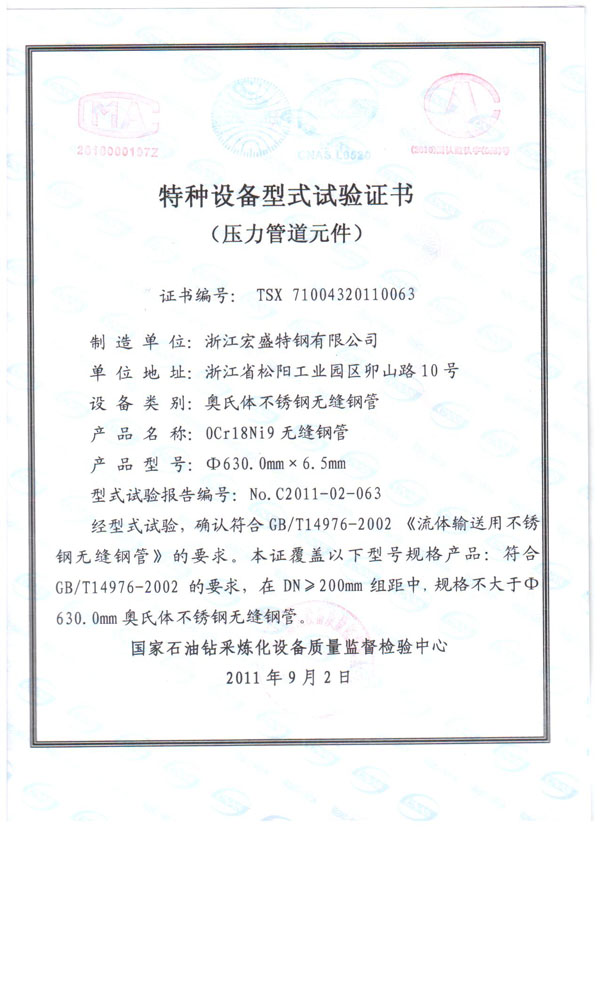 我們公司制造 牌號:0Cr18Ni9 規(guī)格:630mm×6.5mm 的大口徑薄壁不銹鋼管(無縫),通過國家石油鉆采煉化設備質量監(jiān)督檢驗中心的特種設備形式試驗,證書編號:TSX 71004320110063 代表著我們在大口徑薄壁不銹鋼管(無縫)的制造技術在國內(nèi)處于領先的水準。目前也是浙江地區(qū)唯一可生產(chǎn)此類規(guī)格大口徑薄壁不銹鋼管(無縫)廠家。