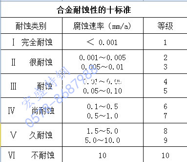 下圖列出了不銹鋼管耐全面腐蝕時的十級標準。選擇哪一級來滿足設備、構件耐腐蝕的要求,除壽命長短外,設備、構件的特點(厚、薄、大或小)和對所生產產品的質量(雜質、純度、顏色等)要求也在考慮內。例如,對使用過程中,要求保持設備、構件光潔鏡面或尺寸精密的以及對產品的雜質、純度、顏色有特殊要求的用途,一般選擇1~3級標準;而對要求不高,檢修方便或壽命要求不是很長的設備、構件,則可選用4~6級標準。但是,在正常情況,大于6級標準是不選用的。