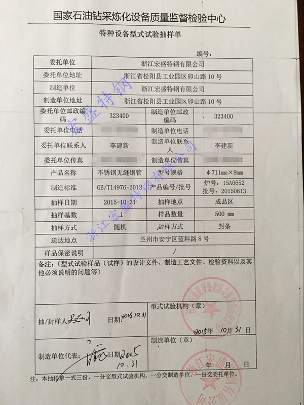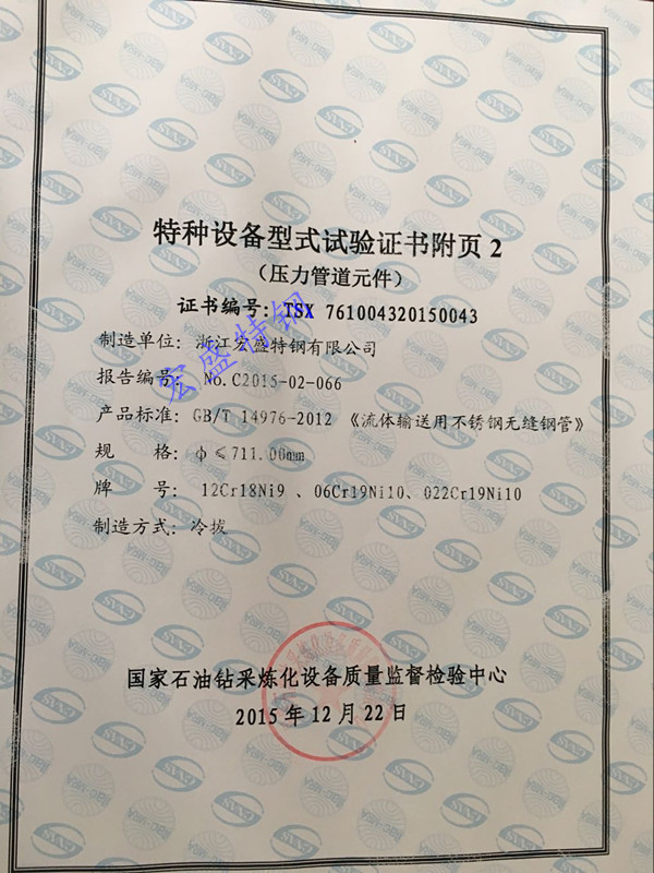 2015年12月22日,公司生產的規格為:711mm×9mm大口徑薄壁不銹鋼無縫鋼管,通過國家石油鉆采煉化設備質量監督檢驗中心特種設備型式試驗。